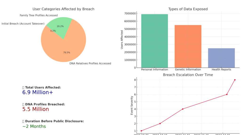 The breach wasn’t from traditional “hacking” their systems—it was caused by credential stuffing, where attackers reused passwords leaked from other sites to log into 23andMe accounts. But that didn’t soften the blow. Once they got in, they were able to use 23andMe’s DNA Relatives tool to gather even more data connected through family trees.